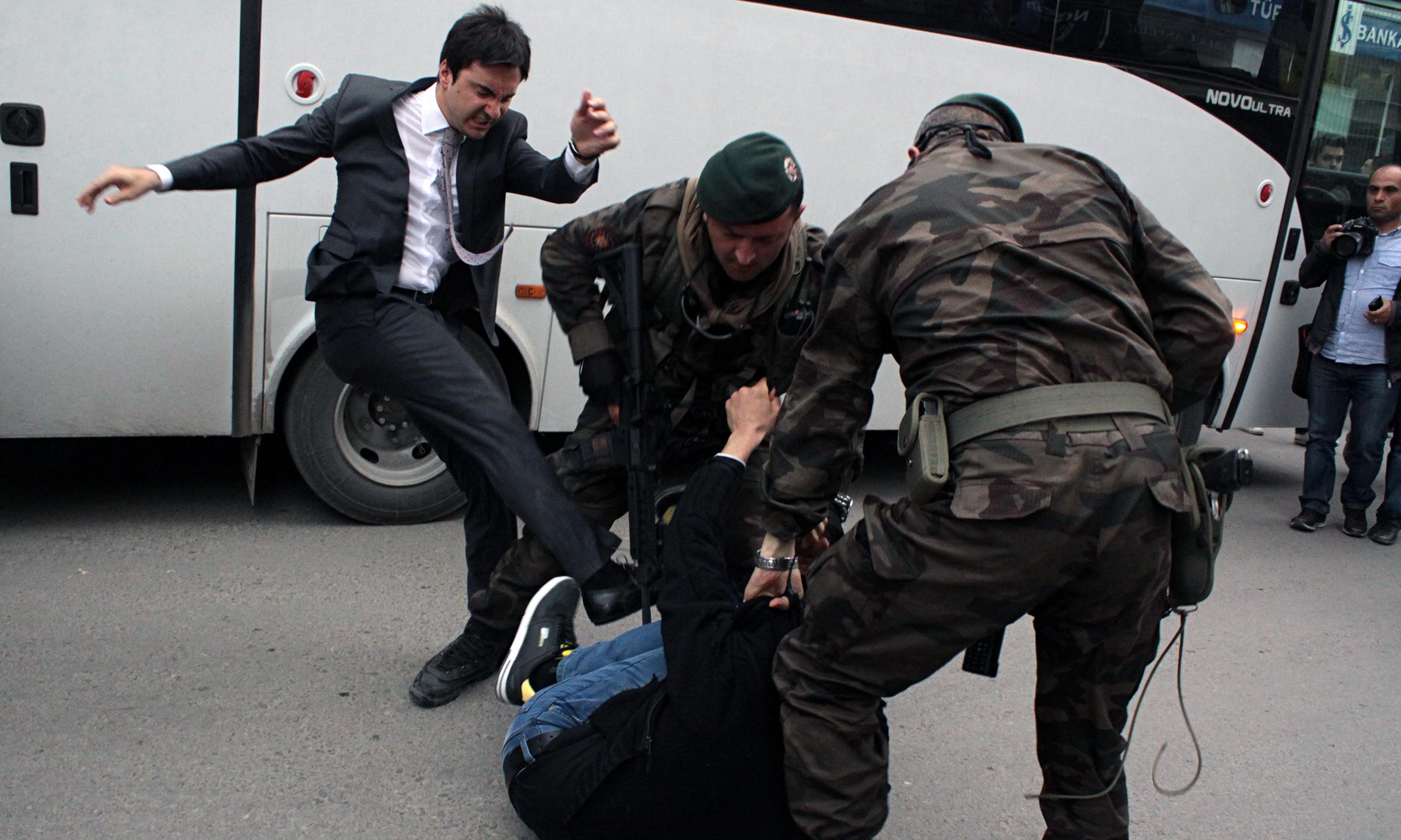 On May 13, 2014, 301 miners lost their lives because of a tragic accident took place in a coal mine in Eynez region of Soma province. Then prime minister Erdogan visited the town however he faced protests in the town. This shot was taken when Mr. Erdogan’s aide Yusuf Yerkel was beating one of the miners after he was taken down by security forces.